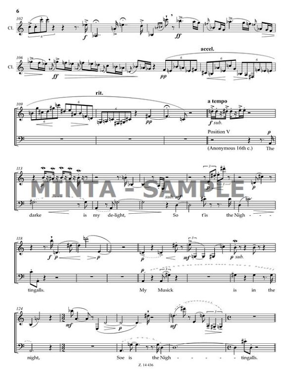 Albert Ehrenstein (1886-1950) expresszív, indulatokkal teli költeményére válaszol egy 16. századi ismeretlen angol költő csendes meditációja zene és éjszaka összetartozásáról. Két nyelv, két korszak és a költészet két homlokegyenest eltérő felfogása kerül inspirálóan közel egymáshoz ebben a schuberti intimitást idéző, mégis igazán posztmodern dalciklusban. A mű korábbi, visszavont verziója tenor hangra készült, több koncerten és lemezfelvételen is ez a változat volt hallható Bubnó Tamás és Rozmán Lajos előadásában. A szerző mégis jobbnak látta mélyebb énekhangra átdolgozni a művet, amely így közel tíz évvel a bemutató után nyerte el végleges formáját.