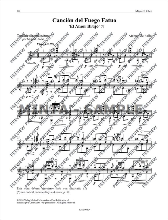 Falla was enthusiastic about Llobet's performances of the Homenaje and he greatly appreciated Llobet's transcriptions of the 'Romance del Pescador' and the 'Canción del Fuego Fatuo'; these together with the Homenaje figured as a 'Triptych' in Llobet's concert programmes. Both transcriptions are published here for the first time, prepared from Llobet's autograph manuscripts.