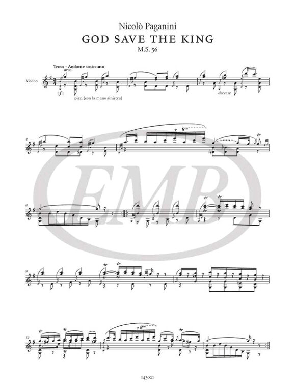 Among the most brilliant of Nicolo Paganini’s numbers for solo violin, the Variations on „God save the King” (M.S. 56) are outstanding in their musical refinement and their bold virtuosity. Composed in 1829, the piece opens with the tune of the famous anthem already varied, followed by six variations. Conceived with the intention of „convincing the incredulous”, as Paganini himself wrote to his friend Luigi Guglielmo Germi, it constitutes a veritable compendium of the highest school of violin playing in which may be found all the technical artifices invented by the celebrated violinist of Genoa.
