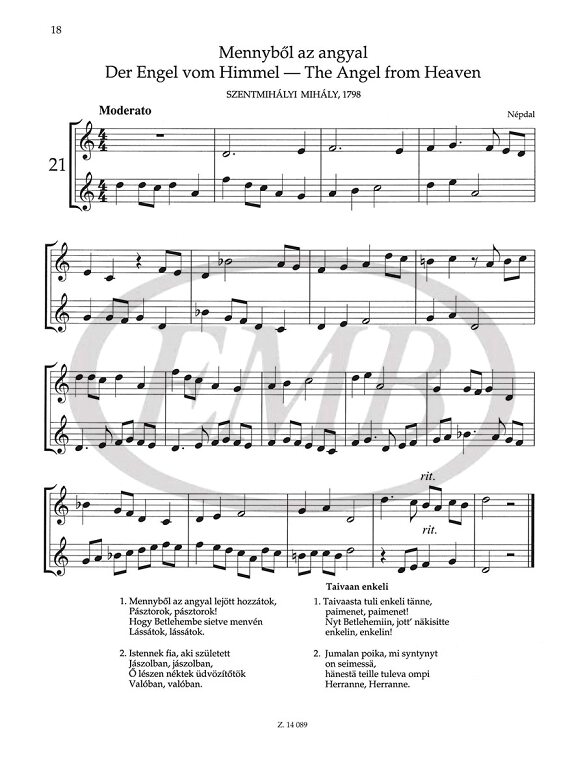 Similarly to the earlier collection published for piano (Z. 14046), this too contains arrangements of widely known or less familiar but in every case attractive and valuable Hungarian folk songs associated with the Christmas festive season. Taking advantage of the opportunity for music-making that Christmas provides, it almost imperceptibly introduces the beginner on the recorder or guitar to the world of Hungarian folk song.