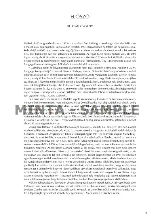 The notebook I gave Márta, which I also continually added to, meant something else to me. When I wrote the words ''K. M. hangjegy koenyvetskéje'' (M. K.'s Music Notebook) on the title page, I thought about the ''Notenbüchlein'' that Johann Sebastian Bach compiled for his beloved wife, Anna Magdalena Bach.