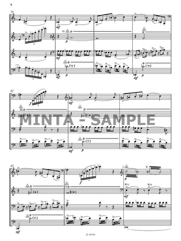 The composer wrote this work in 2004 for the Corpus trombone quartet, to whom it is dedicated. The piece consists of a slow and a fast section, both in rondo form. Its musical language makes use of a great many new elements of playing technique, which provide an excellent opportunity for displaying the fantastically virtuosic capabilities of both the new modes of sound production and the performers: they include Wah-muted notes with modulated tone colour, harmonic-glissandi, sequences of buzzing notes sung into the instrument, valve-modulated harmonic glissandi, rapid double- and tripletongued staccatos, and flutter-tongued, lip-trilled and buzzing lip-vibrating notes. The purpose: playful, good-humoured music-making, to exorcise evil from our lives.
