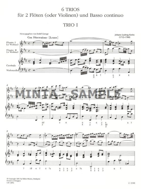 The present edition of the trio sonatas by Johann Ludwig Krebs (1713-1780) is based on pp. 113-158 of a contemporary copy of the trio sonata collection which is held in the Sächsische Landesbibliothek, Dresden, shelf-mark Mus. 1-Q-1. The common title at the beginning of the first trio reads: Sechs Trio a 2 Flauti e Basso. In spite of the consistent indication of instrument in the source the music material of the second flute part suggests an alternative use of instruments. Apart from the characteristic string turns occurring in some places mention should be made of the range of voice up to g of the first trio sonata if the/in first place and particulary of the consistently applied double stops of the second melodic instrument in the first movement of piece No. 6.