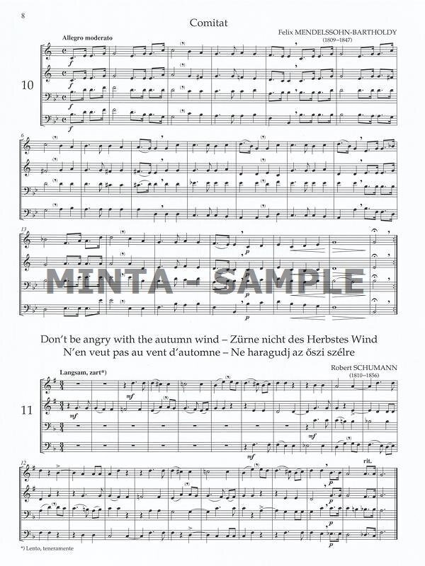 This volume contains mainly transcriptions, the majority of them from four-part choral works, these transcriptions have been prepared by the highly experienced teacher of brass instruments, Péter Perényi. In compiling the collection he was helped by his own music school pupils, who played through a large mass of material and selected the pieces they liked best. The pieces can be played on two trumpets and two trombones (or two tenor horns), the trombone parts avoid the seventh position throughout.